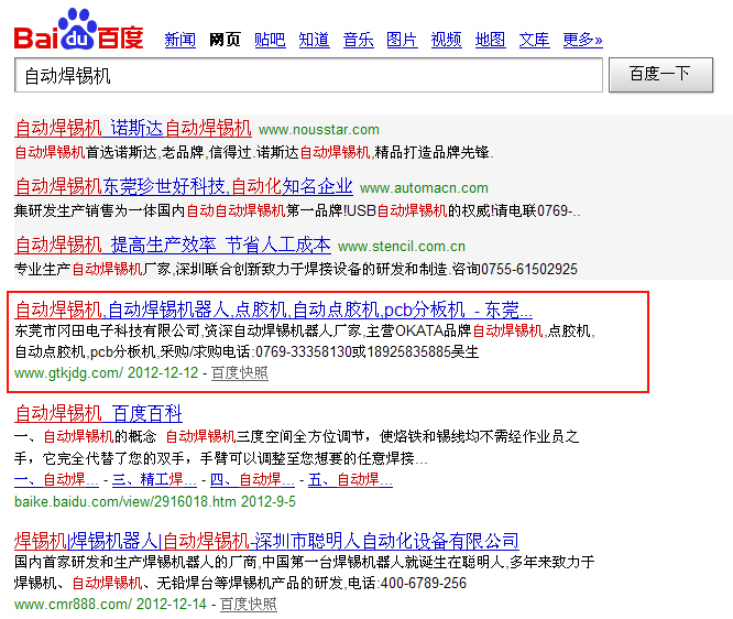 經(jīng)過(guò)我們優(yōu)化團(tuán)隊(duì)的努力,岡田科技的“自動(dòng)焊錫機(jī)”關(guān)鍵詞終于上升到百度搜索第1名了!